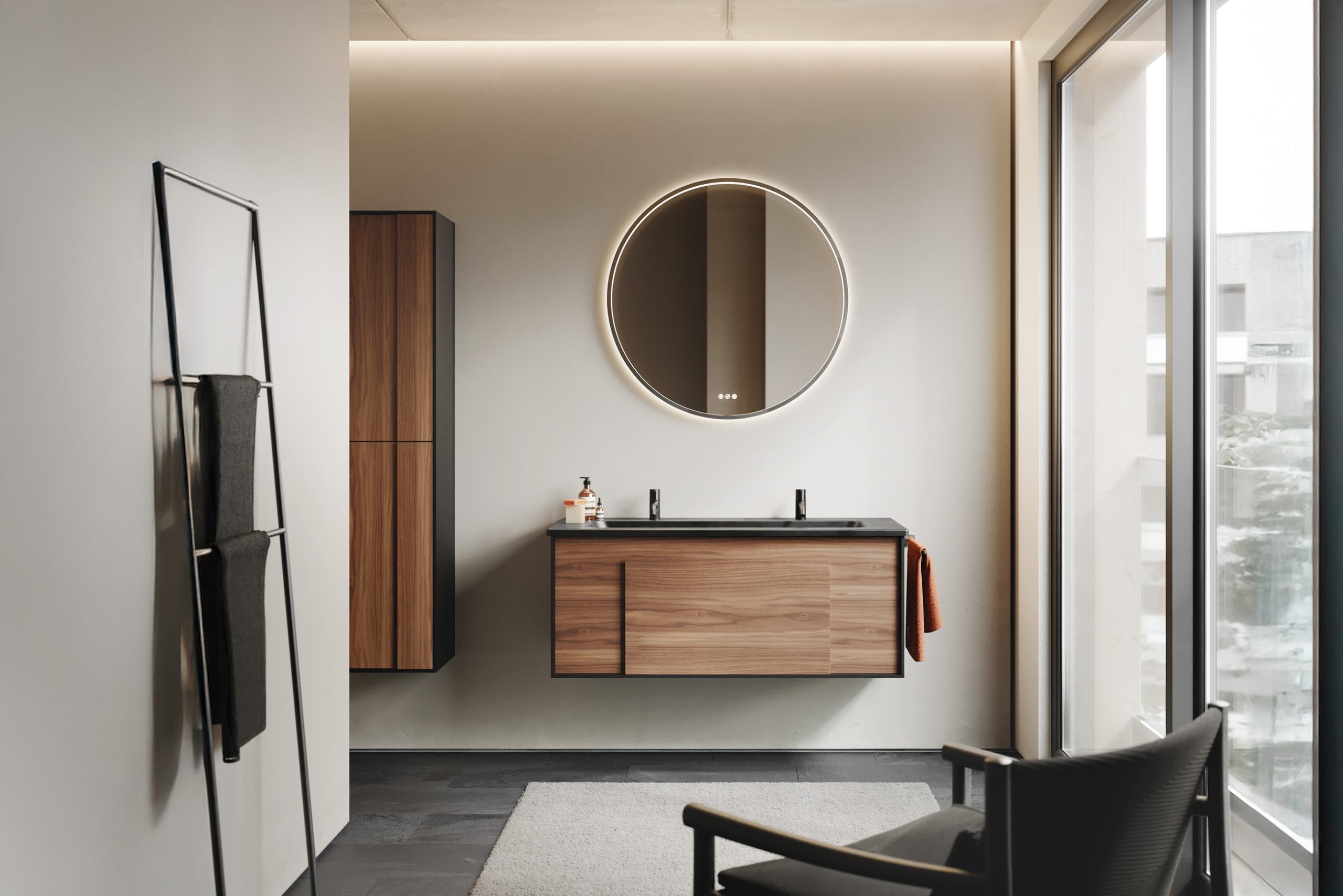 Farbe ist bei Moto integrales Element des Designs. Ob Farbharmonie oder Kontrastprogramm – die Badmöbelkollektion aus dem sys20-Designlinien-Segment zeigt, welche Möglichkeiten in der neuen Farbpalette von burgbad stecken. Moto integriert die miteinander kombinierbaren Basisfarben und Oberflächen in Melamin, Mehrfachlackierung Solid Matt oder Echtholzfurnier und bindet sie durch den Korpusrahmen im Framed Look zusammen. Durch die Option, Fronten und Korpusse (gegen Aufpreis) in jeder Wunschfarbe aus dem RAL-Spektrum fertigen zu lassen, bietet Moto zudem unendliche Möglichkeiten der Raumgestaltung und der Kontextualisierung für ein ganzheitliches Interior Design.