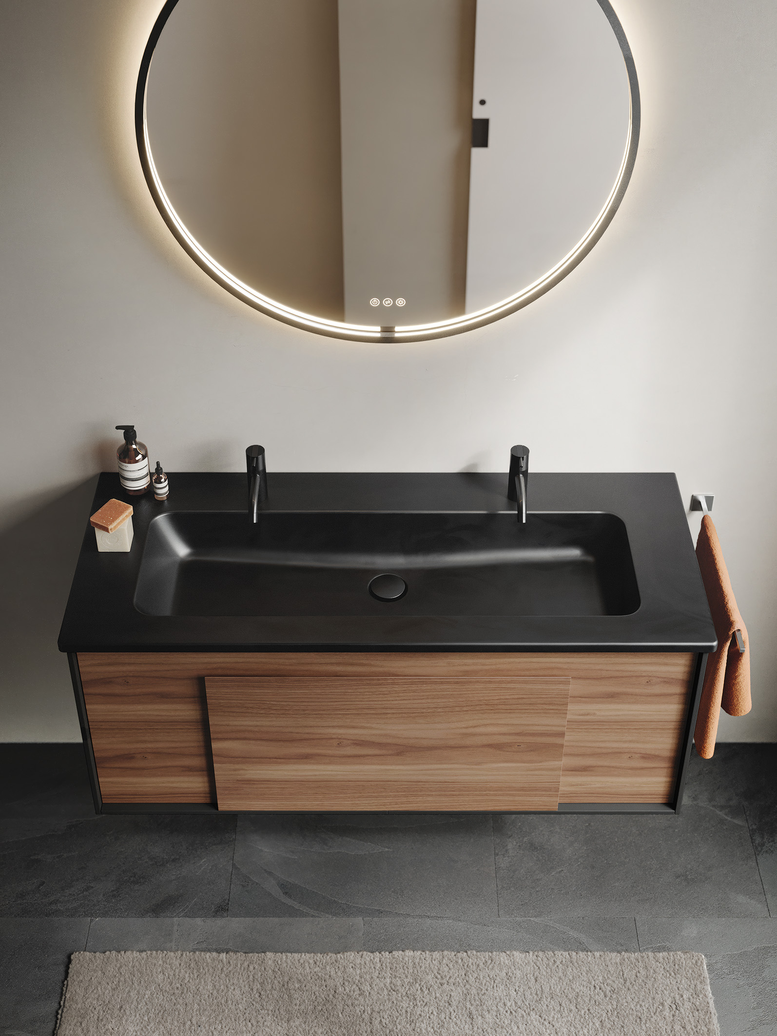 Der in Weiß Matt oder Glänzend ausgeführte Mineralgusswaschtisch nimmt die strenge Rechteckform der aufgesetzten Frontblende wieder auf. Die klar definierte Beckenmulde geht hinten in eine fein profilierte Abkantung über und lässt beidseitig großzügige Ablageflächen. In Keramik wirkt der Waschtisch insgesamt etwas weicher, bildet mit seinem feinen Profil aber ebenso eine Einheit mit dem rahmenden Korpus wie der Mineralgusswaschtisch. Der Keramikwaschtisch ist sowohl in Weiß als auch in Schwarz Matt erhältlich. – dazu ist eine Wahl des Korpus in Schwarz (Wunschfarbe) von besonders eleganter Wirkung. Besonders elegant ist die Kombination mit Fronten in Echtholzfurnier Nussbaum Cognac. Die schwarz gerahmten warmen Holztöne wirken genauso gediegen wie modern. In der Mineralguss-Ausführung ist der Waschtisch in den Breiten 80, 100, 120 und als Doppelwaschtisch in 140 cm verfügbar, in Keramik ist er von 80 cm bis zu einer Breite von 120 cm für den Doppelwaschtisch erhältlich.
