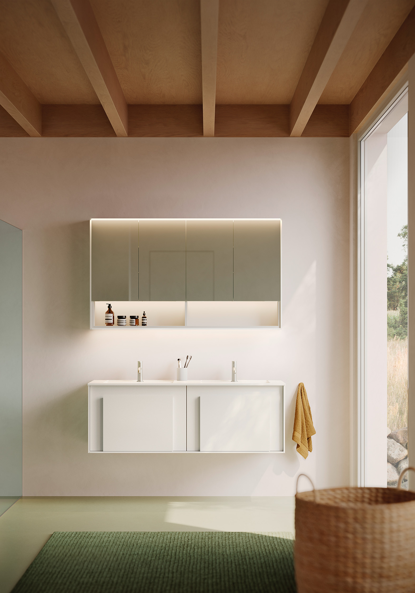 Alle Modelle verfügen über eine Waschtischbeleuchtung. Die über den Spiegeltüren eingesetzte horizontale LED-Beleuchtung kann als vorkragendes Lichtsegel oder als dezentes, bündig integriertes Lichtband gewählt werden. Zu der hochwertigen Innenausführung gehört unter anderem auch die neue E-Box mit Drehschalter zum Dimmen und zur Lichttemperatursteuerung, eine Steckdose und zwei USB-C-Ports.